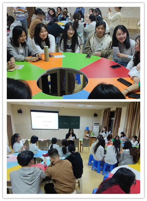 接着,员工用英文展示歌曲演唱、朗诵及现场配音等才艺。员工围绕主题“The Opinions on Nursing Profession”、“Movie dubbing”分小组进行自由讨论,教师深入员工小组,根据每个员工的兴趣爱好积极引导他们进行口语交流,并就其交流的内容、频次、形式等进行拓充强化。员工代表刘甜钰进行主题讨论内容展示。