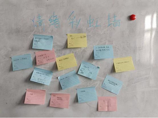进入正念呼吸挑战环节,在背景音乐中,全体参与者体验了“吸气4秒--屏息7秒--呼气8秒”的呼吸节奏,并在持续的沉浸式体验后,将书写着感悟的彩色便签贴满整面情绪彩虹墙。活动最后形成的彩虹墙减压记录,以视觉化方式展现了集体心理疗愈的力量。
