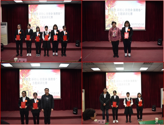 经过激烈角逐,康复2001班张佳璐同学以精彩的《盘龙卧四史,青年展雏翅》斩获一等奖,并由党总支书记鲁绵茸为其颁奖;康复2001班舒倩同学的《学四史知党辉煌历程,守初心不负青春韶华》以及营养2001班李佳贞同学带来的《初心薪火相传,使命永担在肩》获得二等奖,由学工办主任刘征文老师为他们进行颁奖;护理2001班高梦瑶同学的《坚守初心,不负青春韶华》、营养2001班张田雨同学的《守初心,担使命》以及康复2002班李欣萍同学的《牢记使命,共创未来》获得三等奖,由团总支书记秦绍龙老师为他们颁奖。