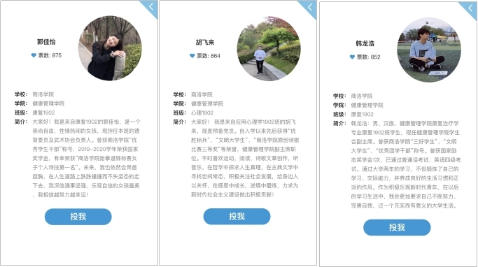 本次活动通过参评员工自行拍摄学习感悟视频,易班工作人员整理编辑将员工分为A、B两组后上传至“学党史,感恩党”平台,最后以员工自主投票的方式选出前三名员工,分别为:康复1902班郭佳怡、心理1902班胡飞来、康复1902班韩龙浩。