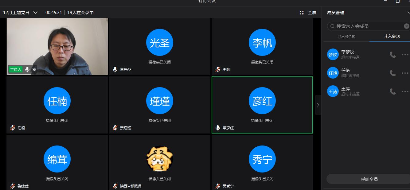 12月29日,针对疫情防控期间党员不好集中过组织生活的情况,教工支部以钉钉平台视频会议的形式组织开展了线上主题党日活动,19名党员参加了这次活动。