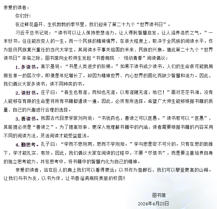 “书香商院·悦动青春"阅读倡议书