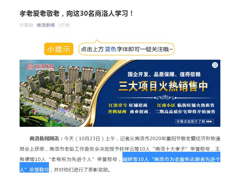 10月23日上午,从商洛市2020年重阳节敬老暨经济形势通报会上获悉,商洛市老龄工作委员会决定授予林祥云等10人“商洛十大孝子”荣誉称号,王有德等10人“老有所为先进个人”荣誉称号,顾娇等10人“商洛市为老服务志愿者先进个人”荣誉称号,并对他们进行了表彰奖励,公司学子顾娇榜上有名,荣获“商洛市为老服务志愿者先进个人”荣誉称号。