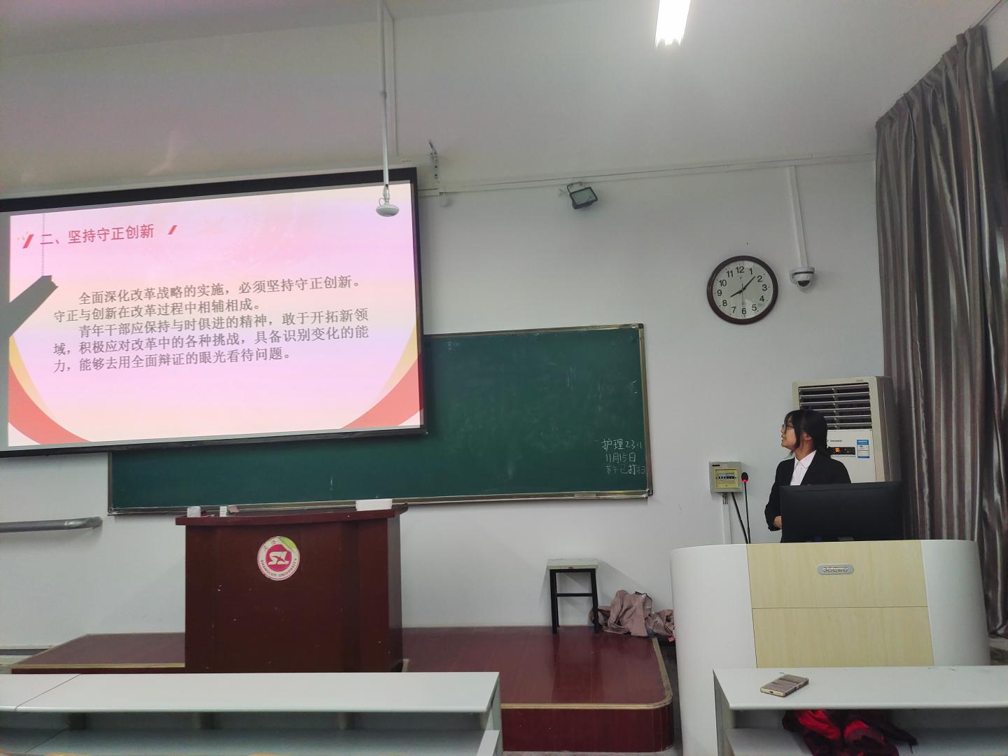 培训会由主题宣讲和团务培训两部分组成。“红色号角”宣讲团成员周丽卿、张佳敏两位同学分别以《扬深化改革之帆,圆创新强国之梦》、《心系家国情怀,勇担时代使命》为主题进行了宣讲,号召青年朋友传承红色基因,不畏艰难、勇于担当,努力学习科学文化知识,用实际行动来践行青春誓言。团总支副书记张怡睿、李奕卓对全体参会人员进行了智慧团建操作解答及基础团务知识讲解,帮助团干部明晰团关系接转流程、团日活动展开信息录入方法、规范团务工作流程,提高工作效率和质量。